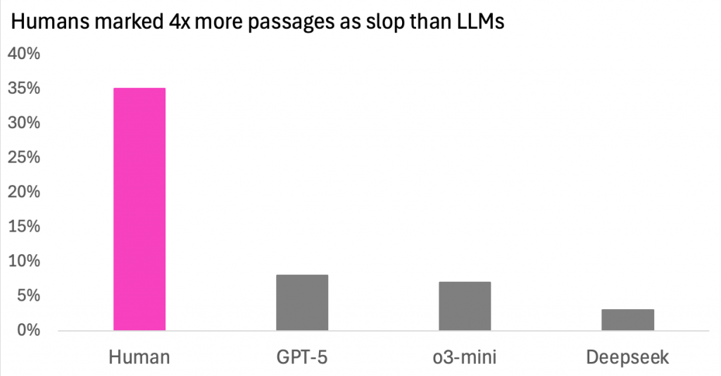 The result:  Human reviewers marked 4 times more passages as slop than GPT-5, o3-mini and Deepseek.